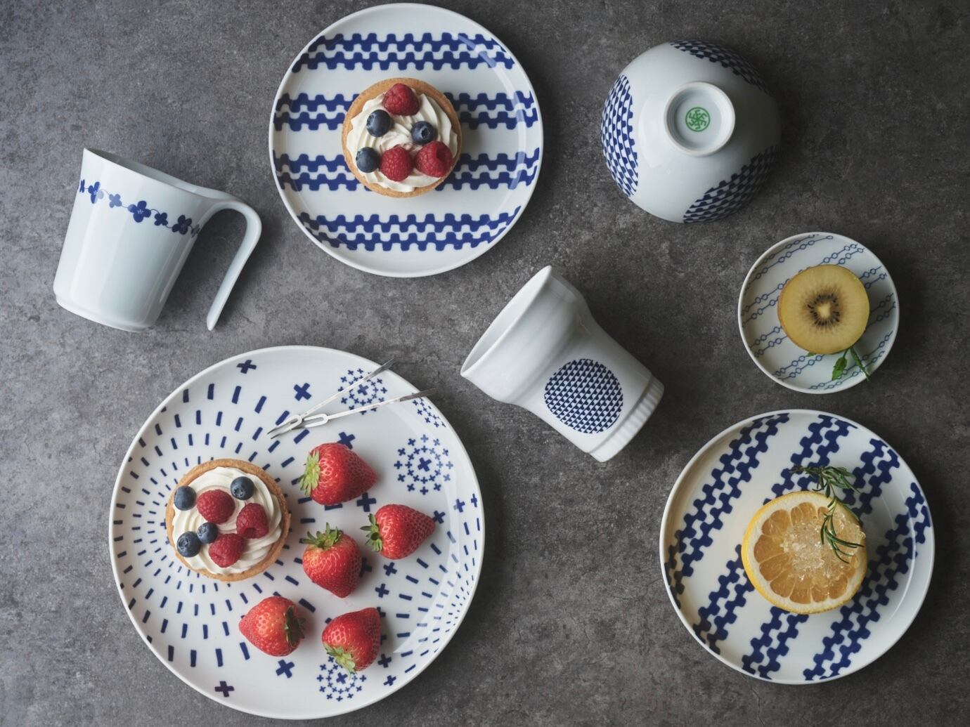 波佐見焼らしい洗練された白磁の上に描かれたモダンなデザイン。