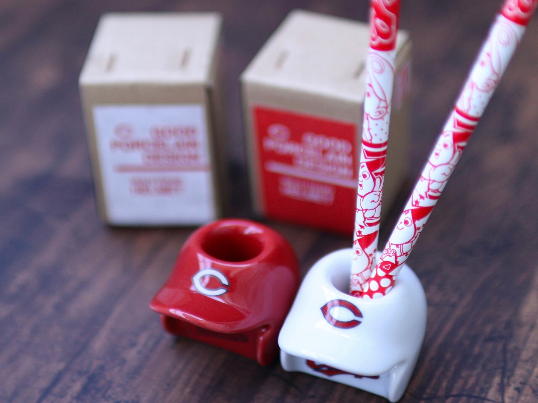 CARPのヘルメットをリアルに再現したこのペン立ては、デスクの上で圧倒的な存在感を放つ
